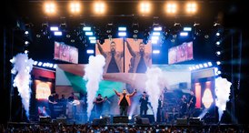 Frei Gilson entoa cânticos e reza para uma multidão em show na Festa do Peão de Barretos